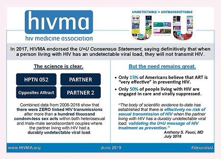 Rooted in years of scientific research about treatment as prevention, the U=U campaign popularized the growing scientific consensus that when you take your HIV medicine, you can achieve viral suppression (sometimes referred to as “undetectable”) and have zero risk of transmitting HIV to your sexual partner or partners. That's literally amazing! This fact is called “Undetectable = Untransmittable” which is abbreviated to "U=U".